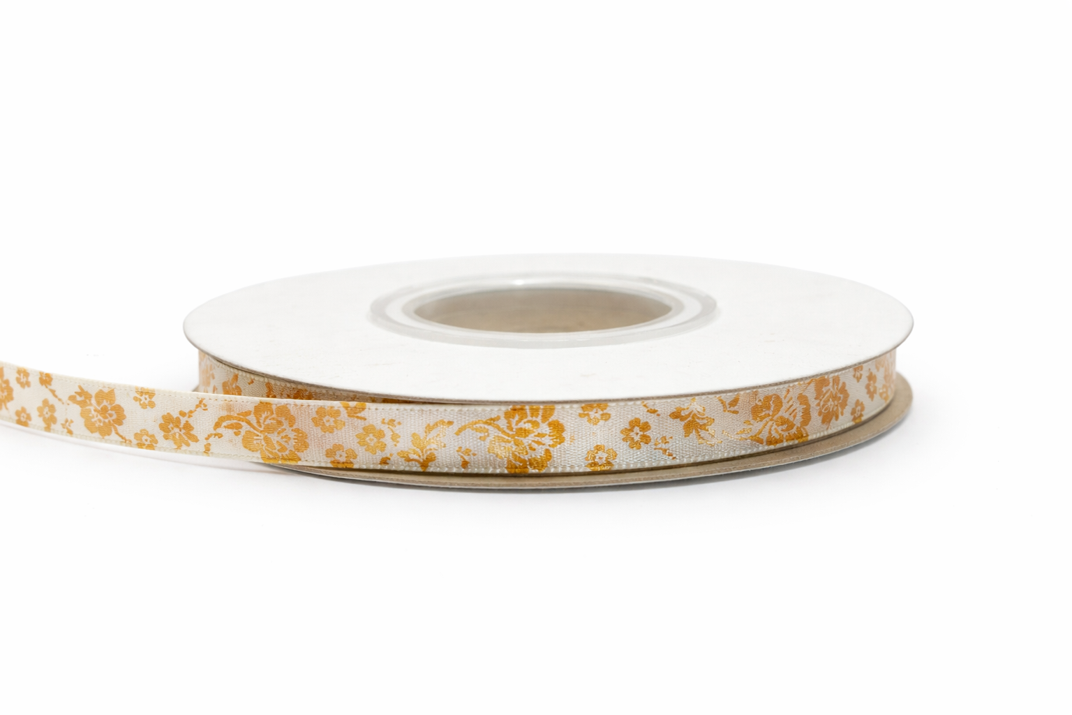 Elegancka wstążka satynowa z delikatnym, roślinnym wzorem w odcieniach złota na jasnym, kremowym tle. Subtelny motyw kwiatowy nadaje jej klasyczny i stylowy charakter, idealny do dekoracji o eleganckim i naturalnym wykończeniu.