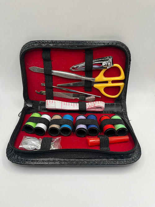 naparstek, nawlekacz, zestaw igieł, agrafki, guziki, mate nożyczki do obcinania nitek, odpychacz do skórek, peseta, pilniczek i obcinacz do paznokci.